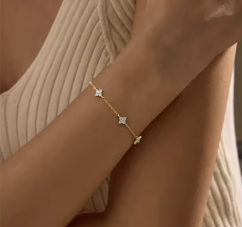 Bracelet doré ajustable orné de ses petites fleurs en strass argenté