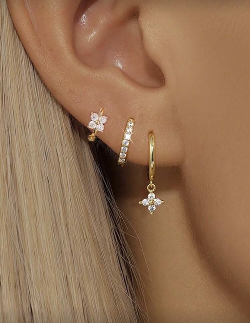 Pack de 3 boucles d’oreilles anneaux doré avec leur strass et petites fleurs